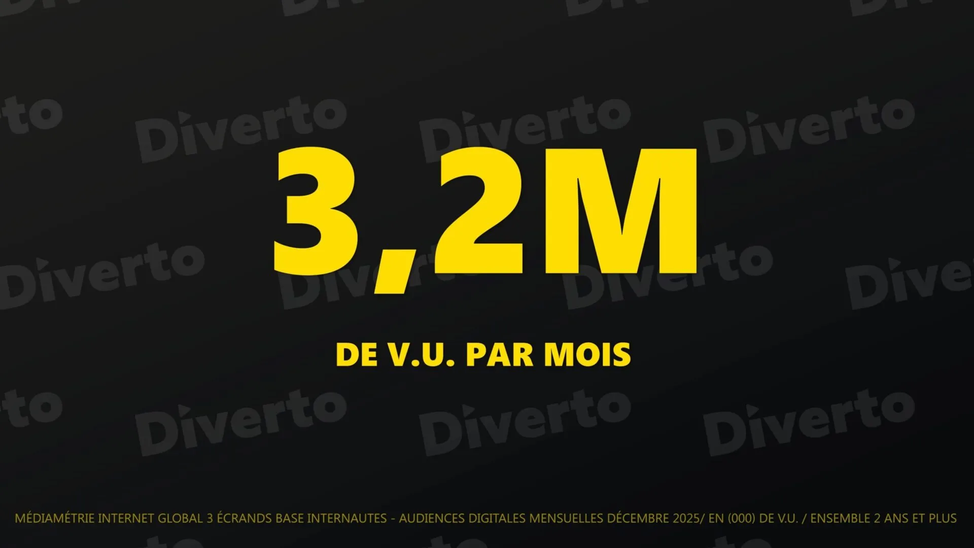 Selon les derniers résultats Médiamétrie Internet Global de Décembre 2025, Diverto.tv réalise sa meilleure audience digitale depuis son lancement, en dépassant les 3,208 millions de visiteurs uniques en décembre 2025, soit une hausse de +32,5 % vs novembre. Diverto reste 5ᵉ du classement des guides TV, avec une audience très majoritairement mobile (79 %).